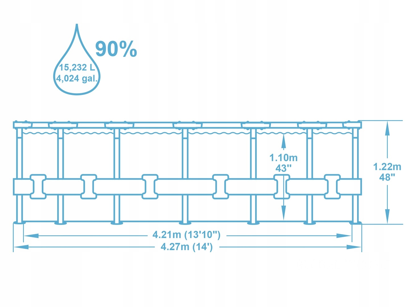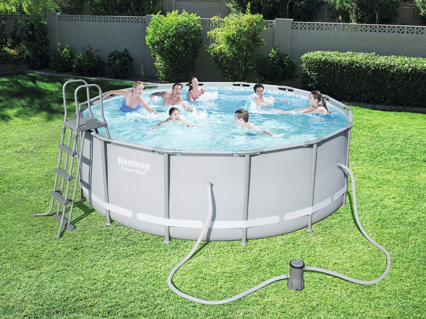 Чаша бассейна изготовлена из высококачественного трехслойного ПВХ: два слоя плотного винила и один — полиэстер для особой прочности. Для дополнительной защиты и поддержания формы используется лента из полипропилена, «опоясывающая» весь бассейн. Стойки каркаса усиленные стальные с специальным антикоррозийным покрытием. Конструкция бассейна надежная и прочная, выдерживает высокие нагрузки, одновременно пользоваться бассейном могут несколько человек.