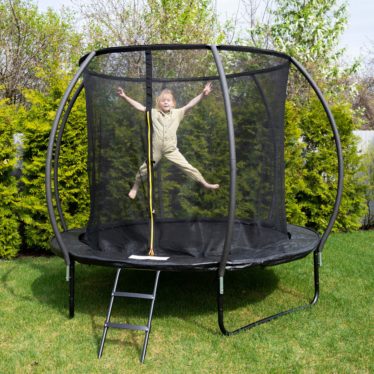 Прочная высокая сетка, тщательно натянутое упругое полотно, закрытые пружины гарантируют максимальную безопасность во время джампинга, качественные материалы обеспечивают долговечность, износостойкость и надежность конструкции.