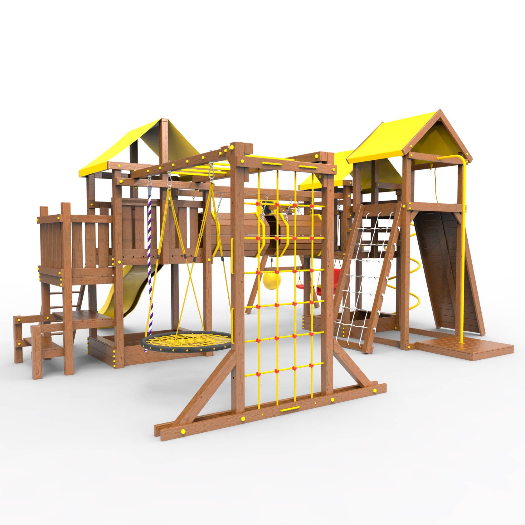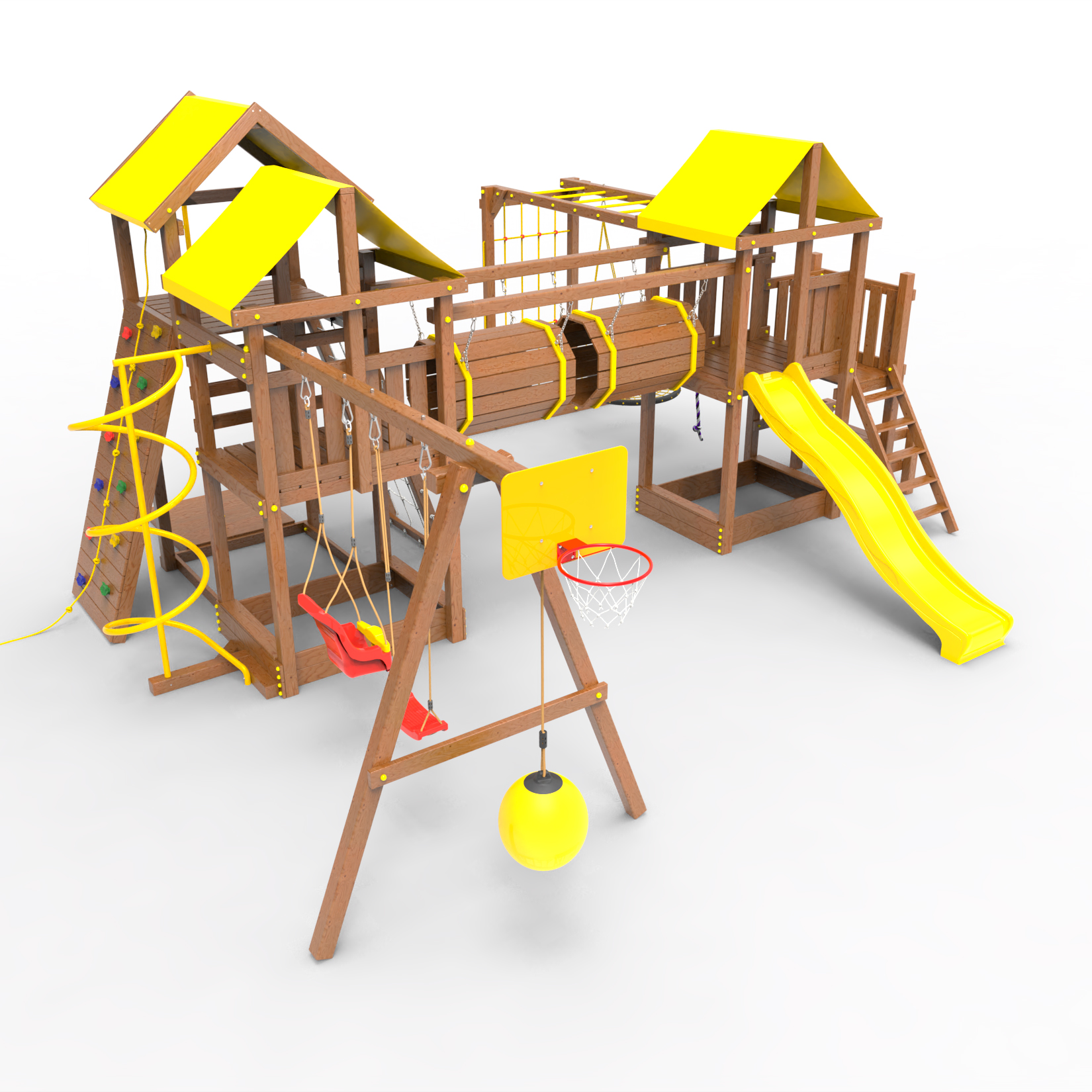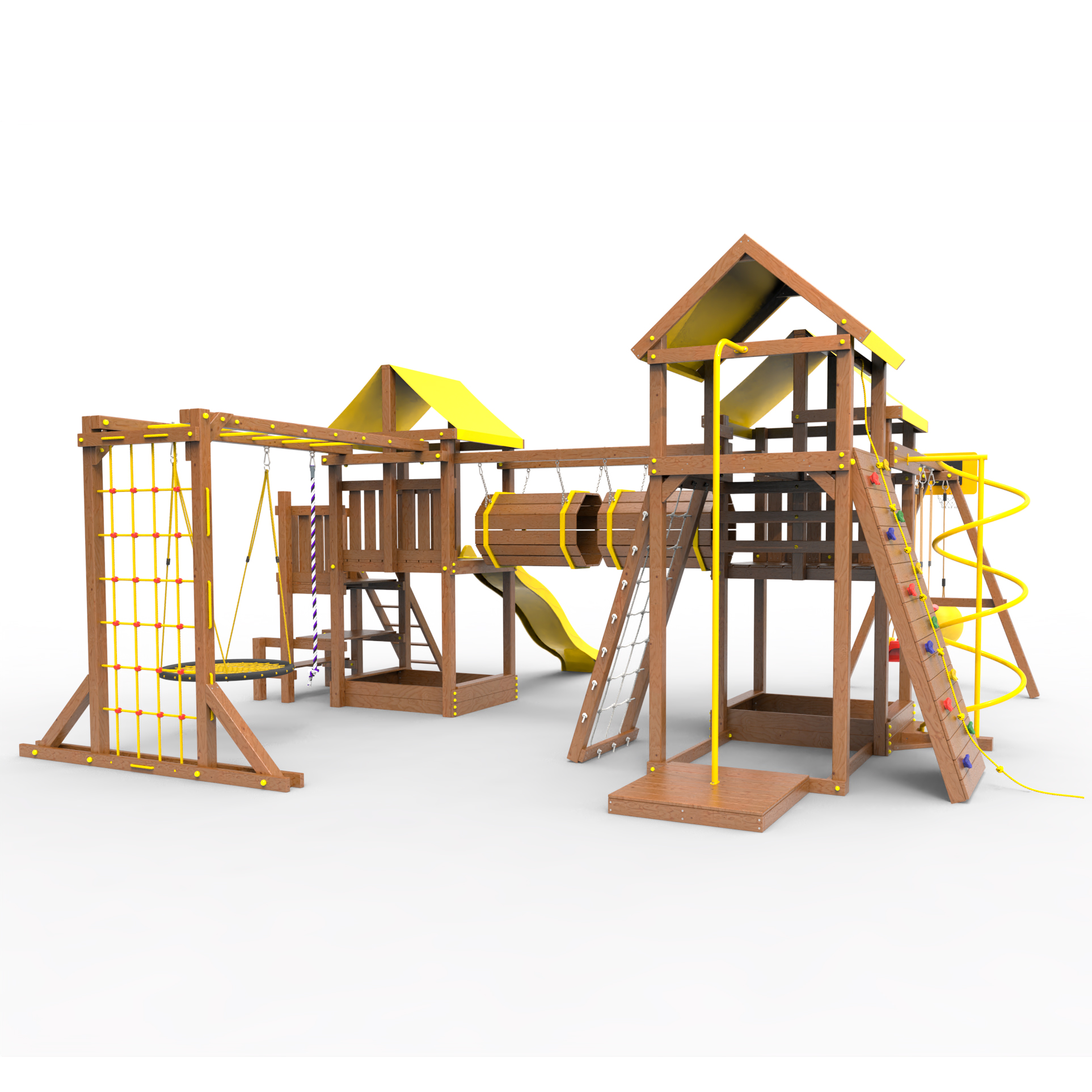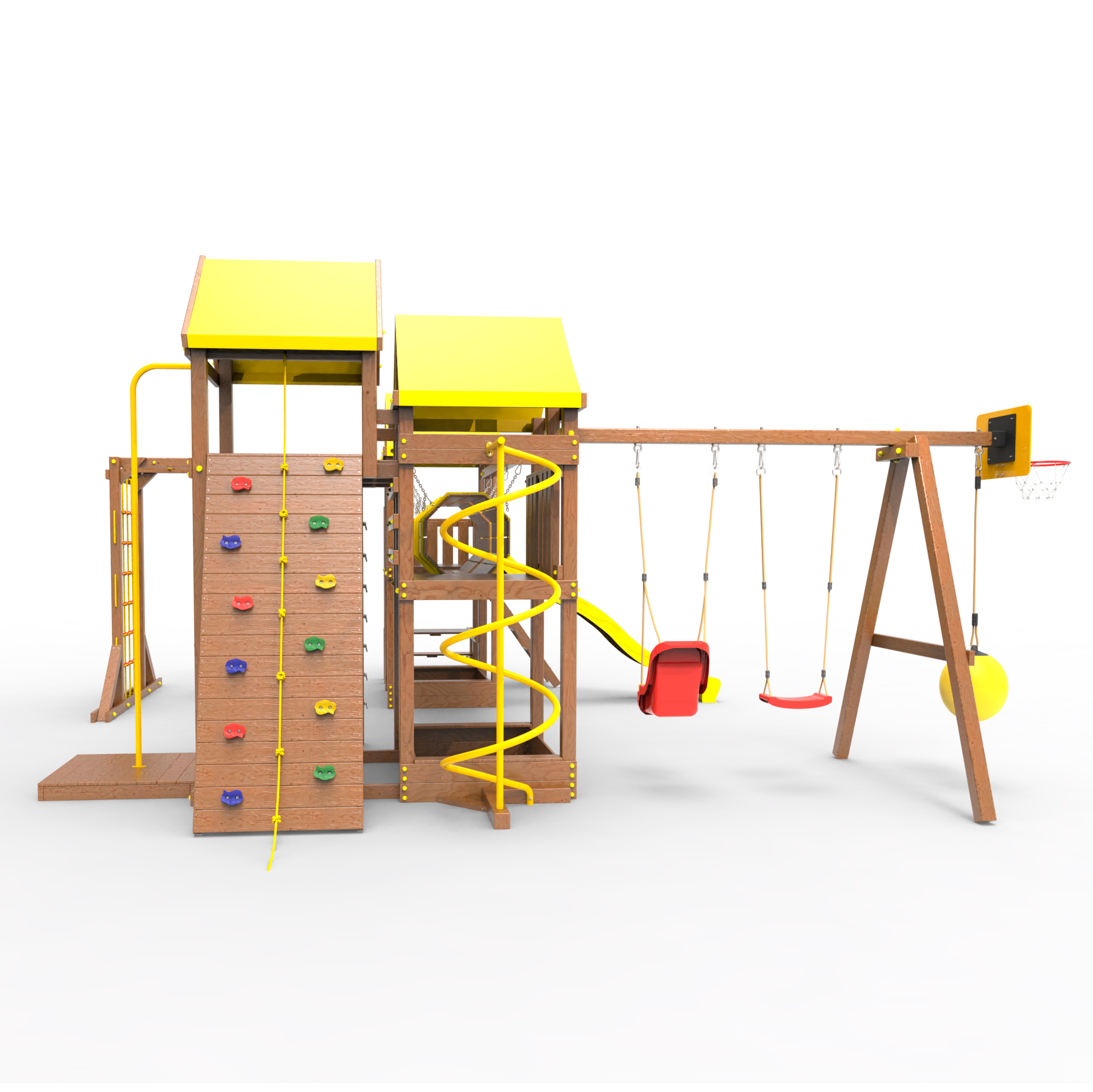 Два домика|Песочница|Лестница|Шторм-трап|Скалодром|Рукоход|Шведская стенка|Турник|Руфер|Баскетбольная корзина|Мостик|Горка|Спираль|Волна|Сеть для лазания|Качели |