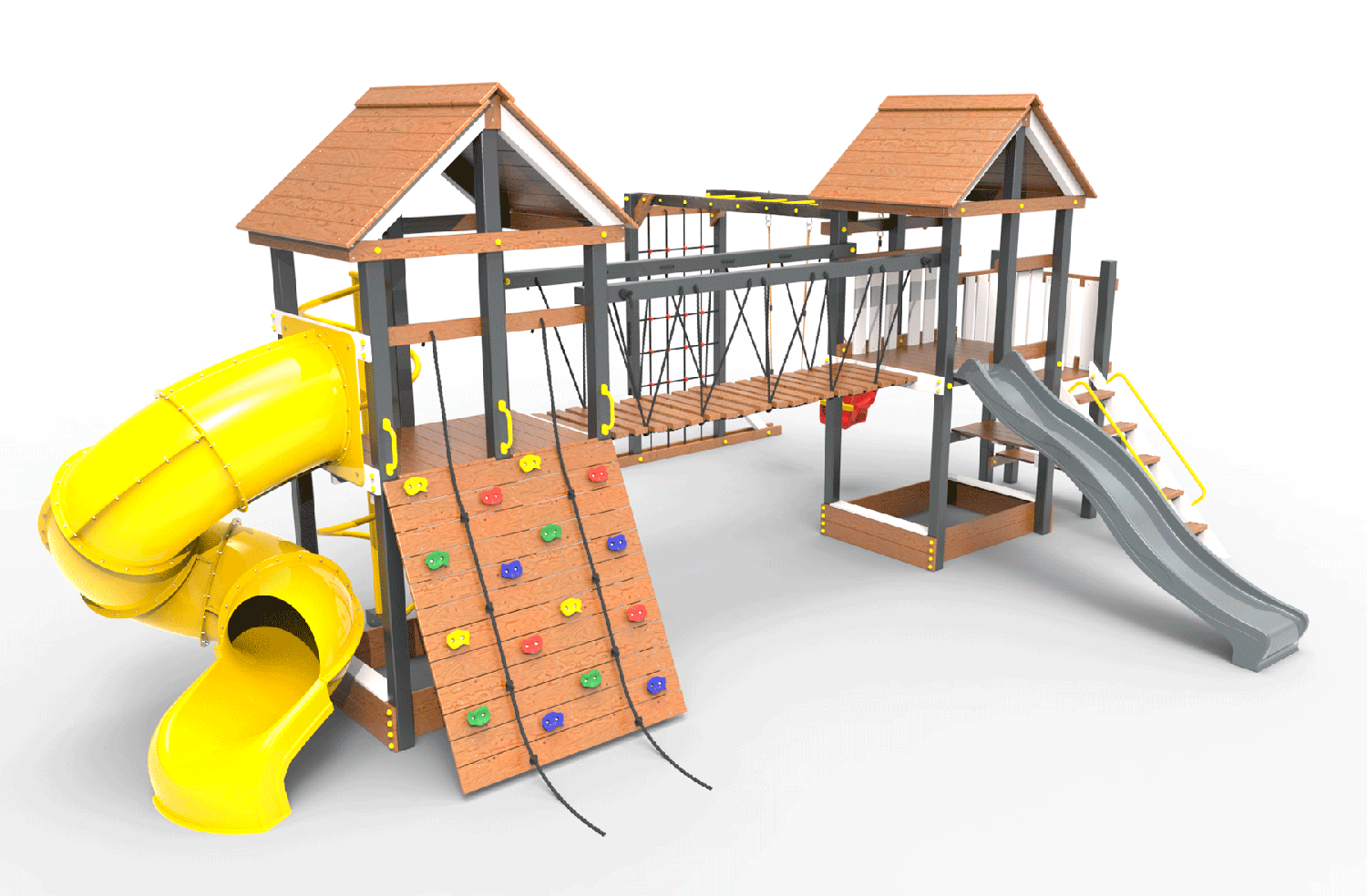 Обращаем Ваше внимание, что фактический цвет детской площадки может отличаться от представленных фото на сайте. Специфика окраски нетоксичными пропитками и красителями допускает отклонения в цветовой гамме отгружаемых изделий. Также обратите внимание, что фактический цвет может отличаться из-за цветопередачи устройства на котором Вы смотрите фото. Производитель оставляет за собой право менять цвет отдельных деталей и комплектующих(включая пластик, канаты и пр.), при этом сохраняя весь функционал и характеристики товара.