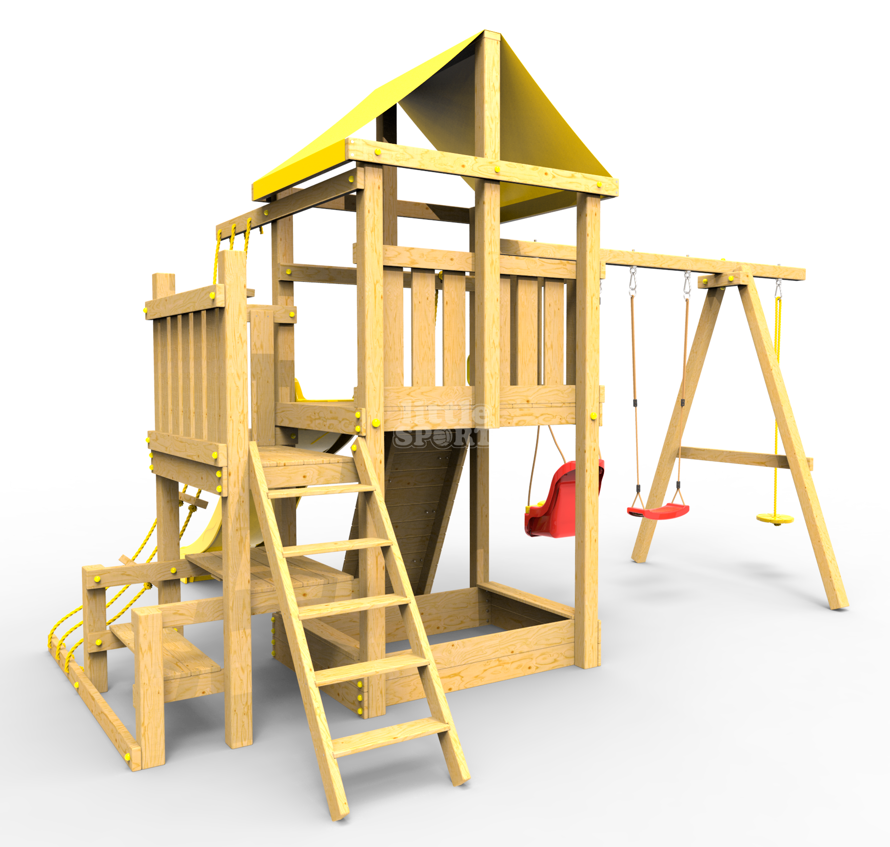 ● деревянная крыша ● трап 2м с канатом ● поручни для лестницы ● диван на цепях двухместный ● столик в песочницу