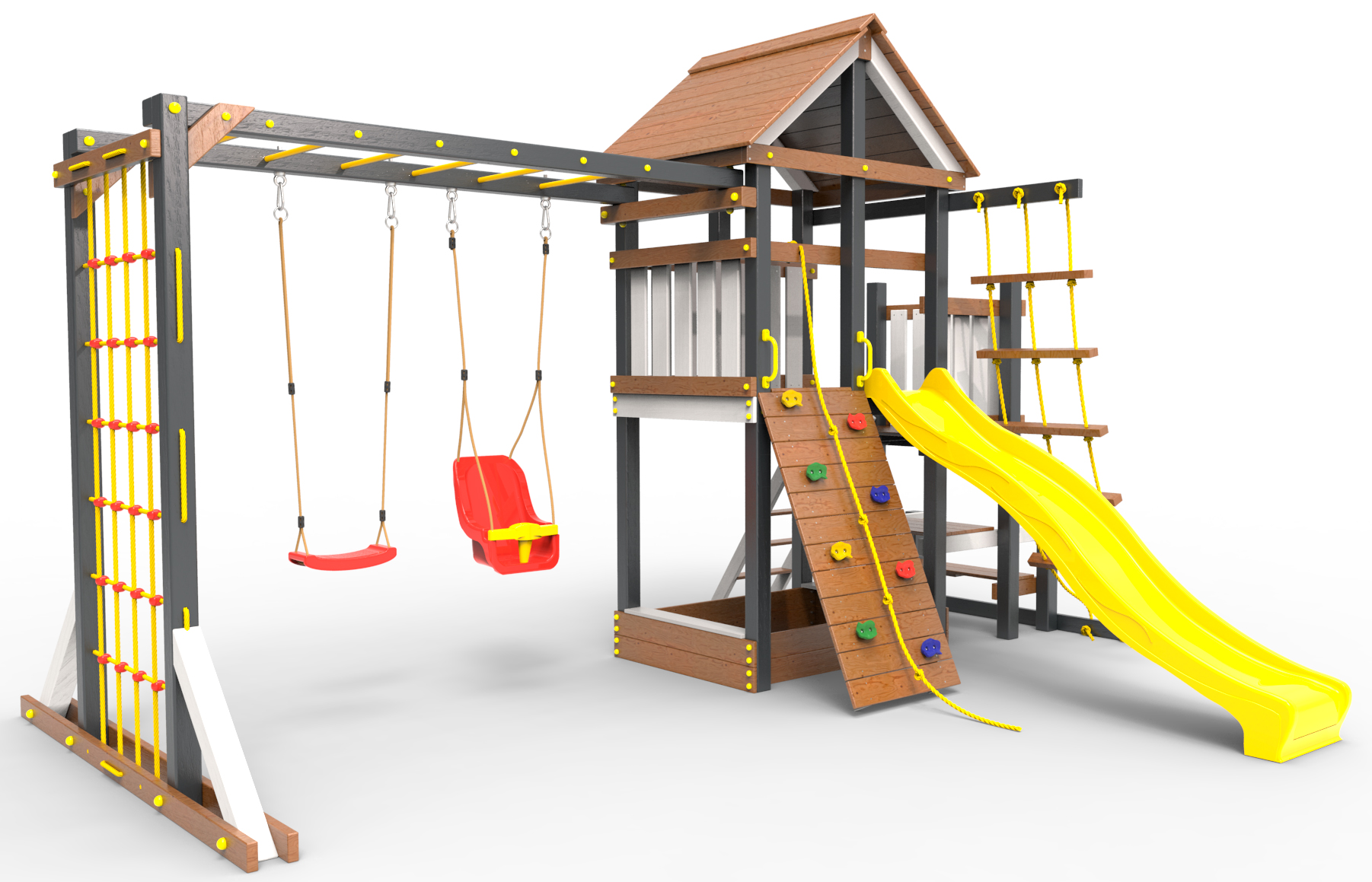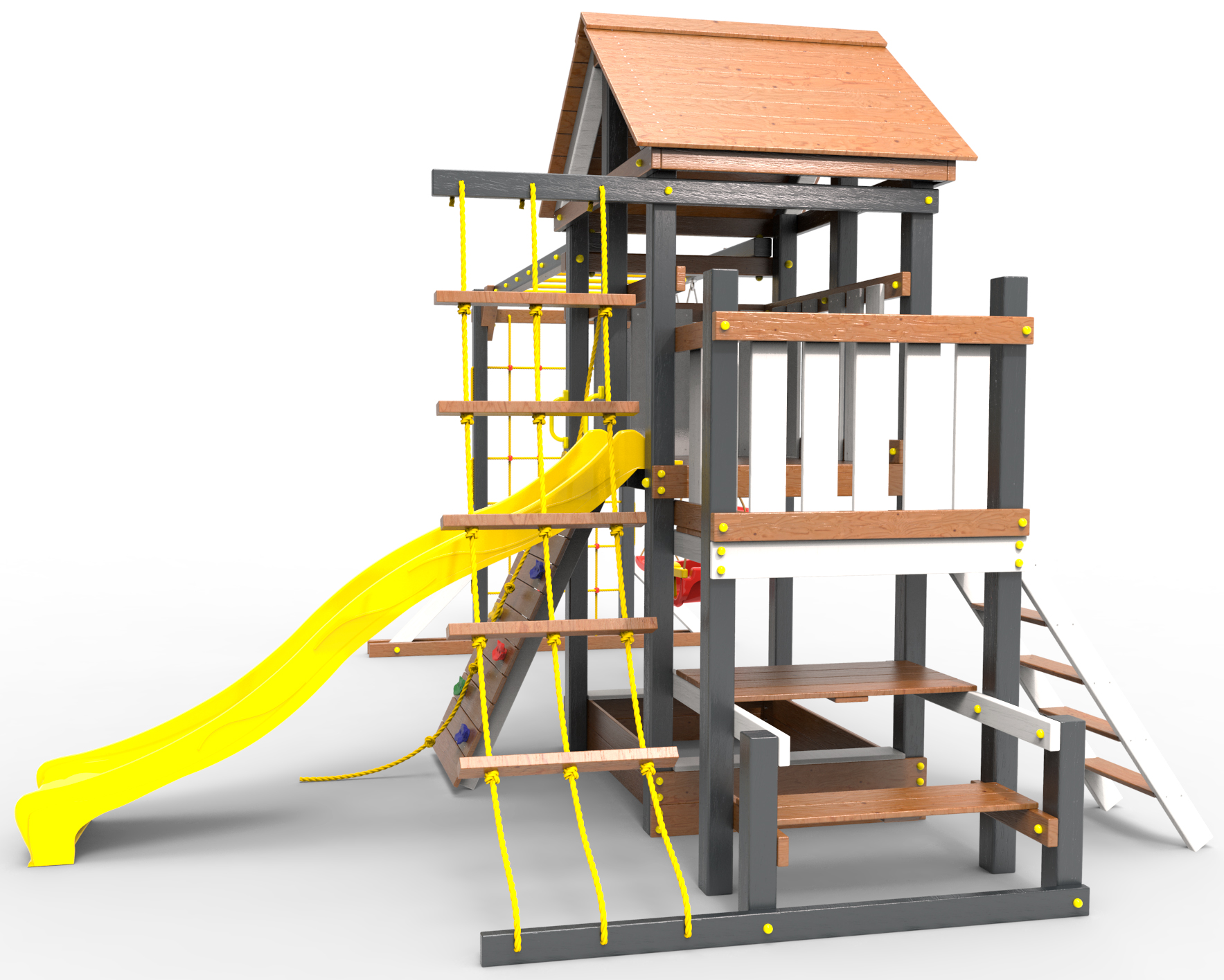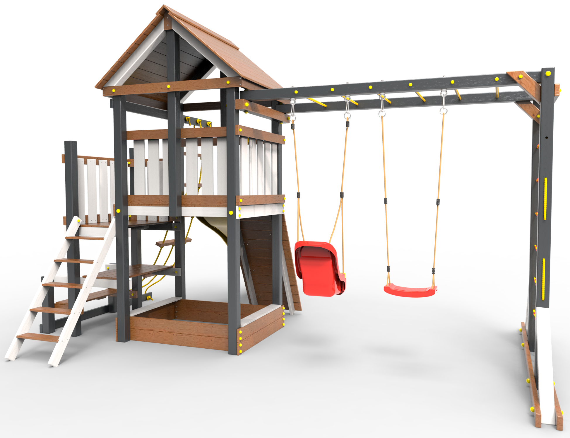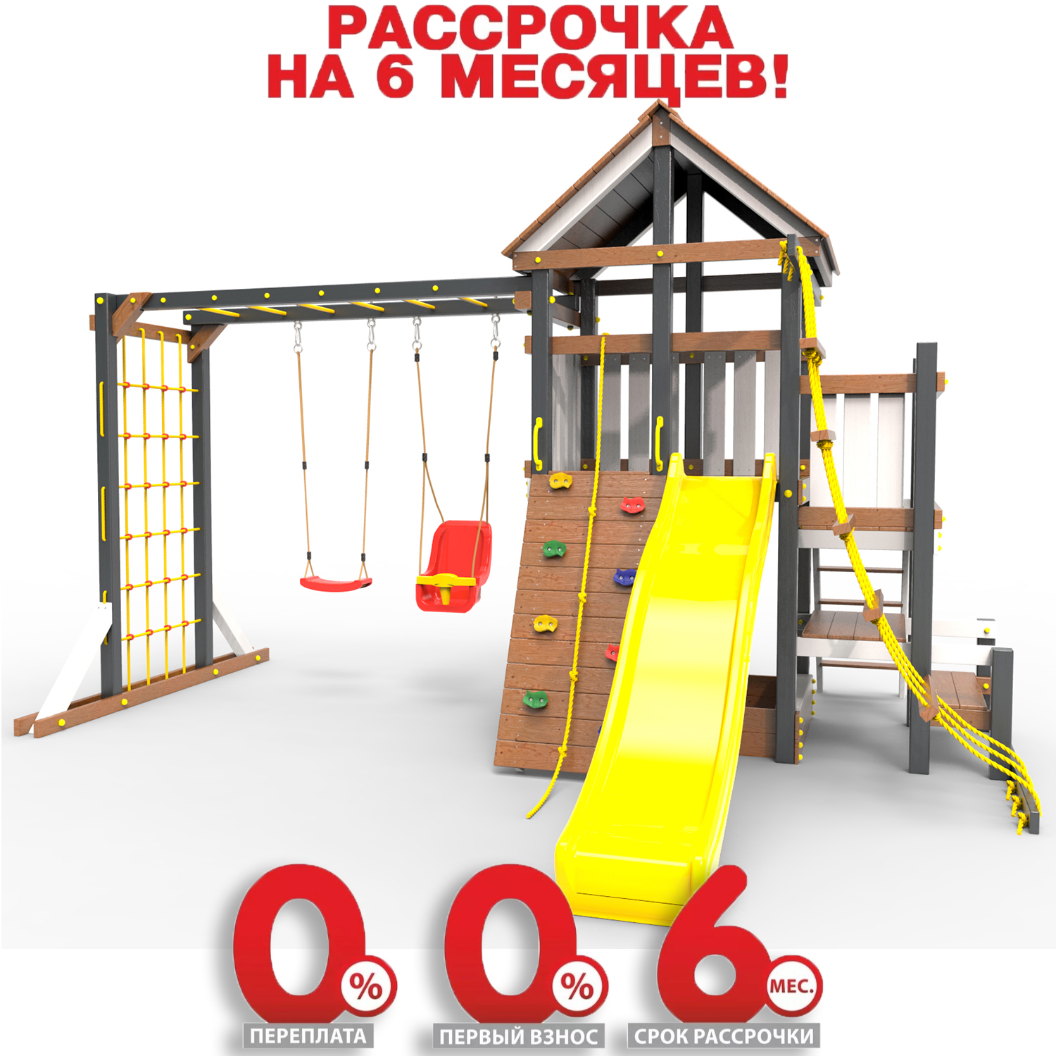Обращаем Ваше внимание, что фактический цвет детской площадки может отличаться от представленных фото на сайте. Специфика окраски нетоксичными пропитками и красителями допускает отклонения в цветовой гамме отгружаемых изделий. Также обратите внимание, что фактический цвет может отличаться из-за цветопередачи устройства на котором Вы смотрите фото.