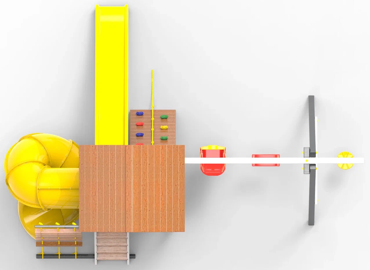 Детская площадка «Пикник Ультра 1 » представляет собой двухуровневую конструкцию, на первом уровне которой расположена песочница, а второй этаж представляет собой игровое пространство под деревянной крышей. Конструкция оснащена качельной балкой, повышенной прочности, которая имеет 5 креплений для качелей или любого другого навесного оборудования, шторм-трапом , двумя горками и скалодромом! .