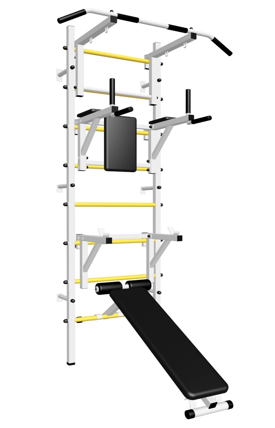 Стойки шведской стенки Sv Sport усиленные изготовлены из профильной трубы 60 х 40 х 2 мм. Ступени изготовлены из круглой, стальной трубы, покрытой резиной (не скользят, не натирают мозоли, не прокручиваются, не имеют запаха, приятны на ощупь). Устанавливается к стене при помощи 6 кронштейнов. На перекладину, в местах хватов, одеты резиновые ручки.