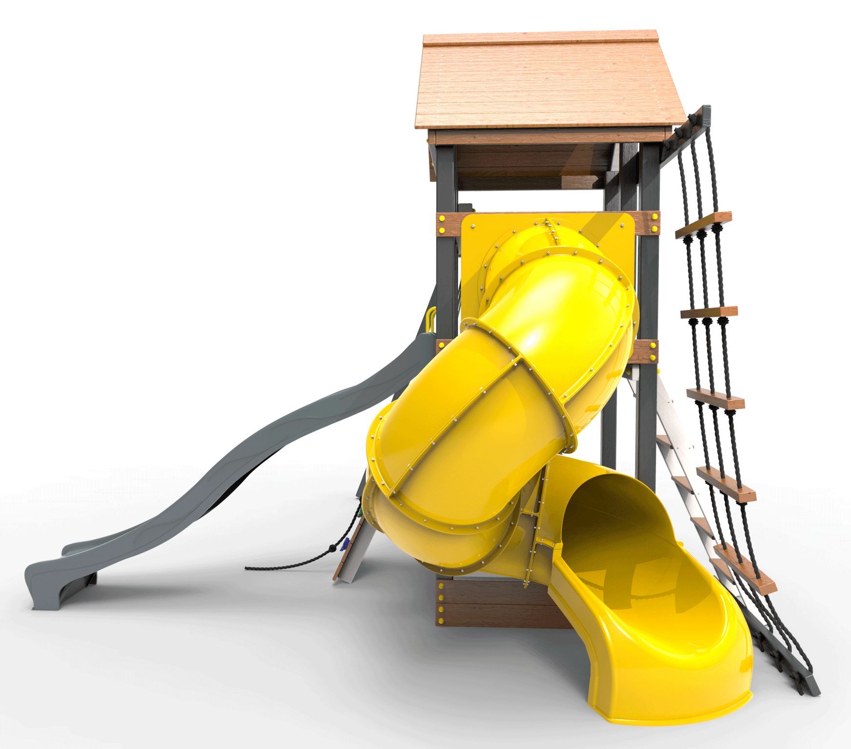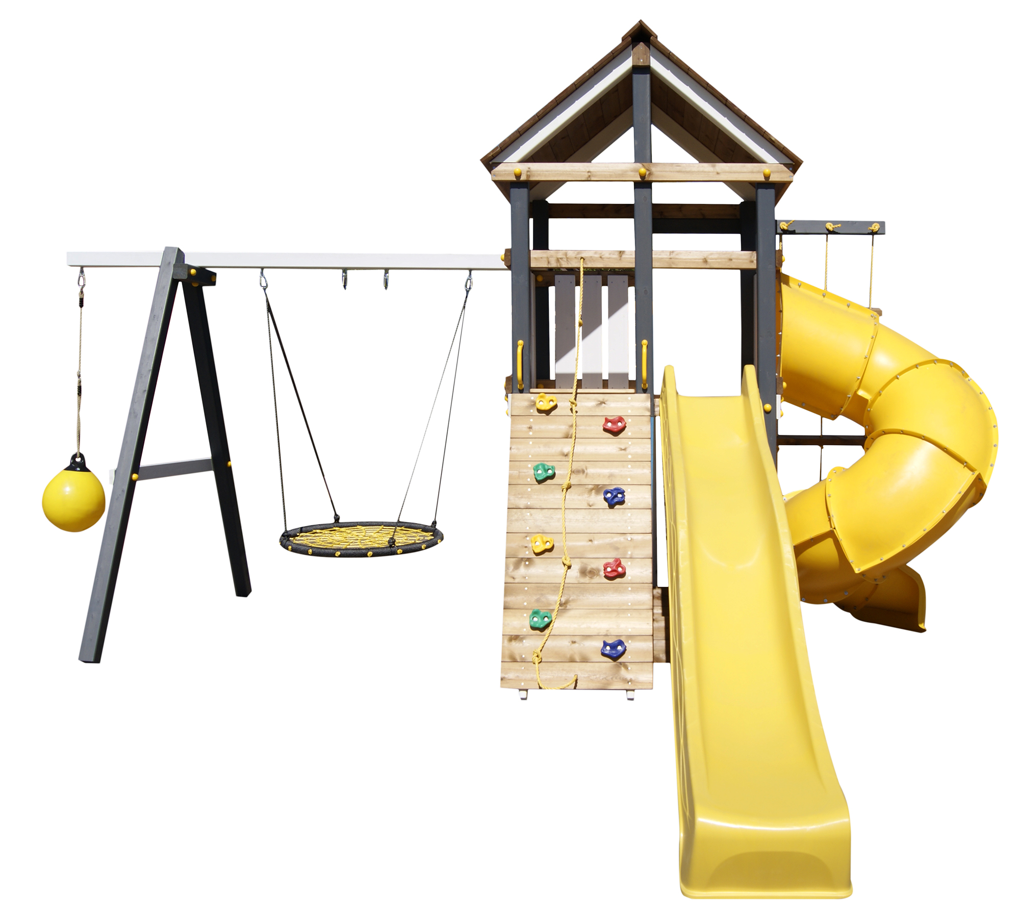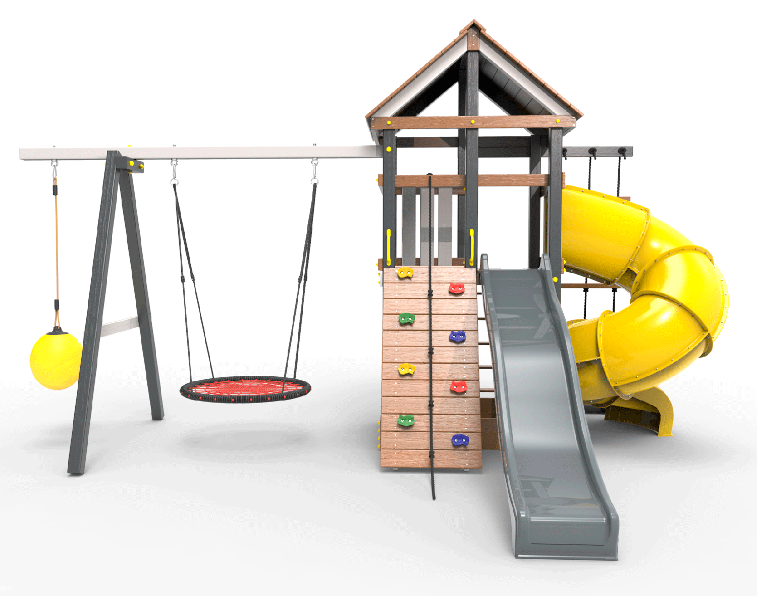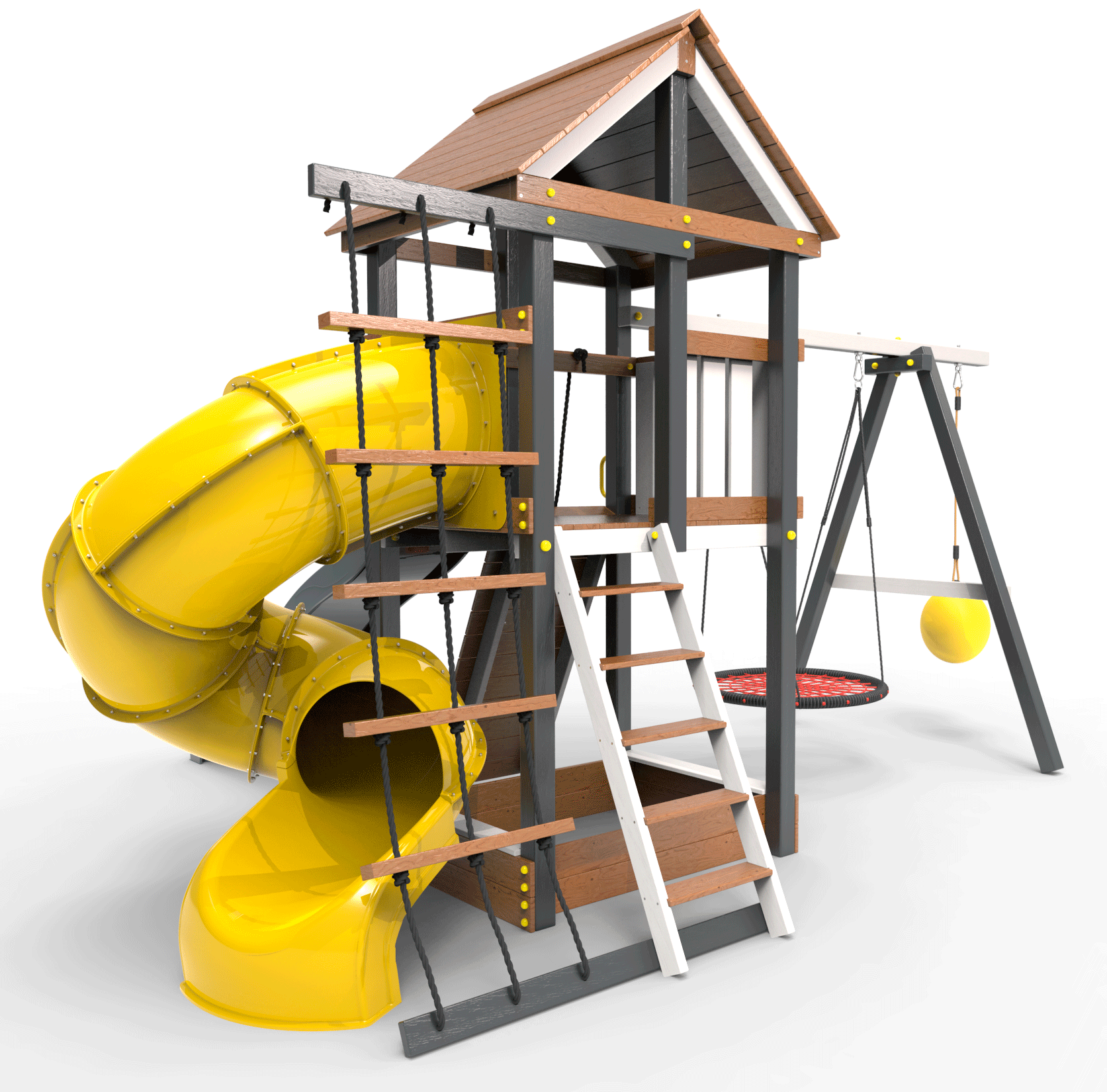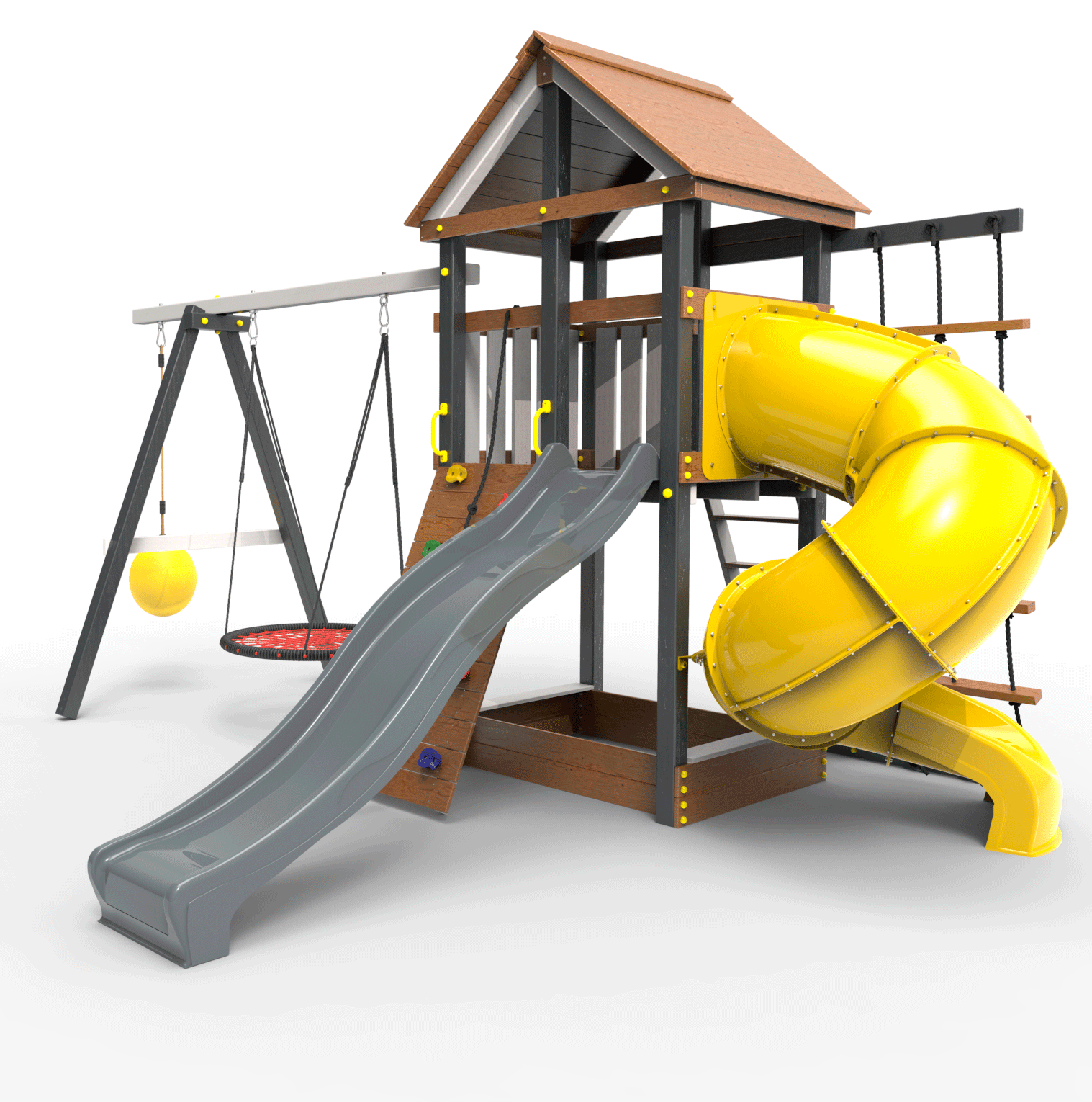Детская площадка «Пикник Ультра 1 » представляет собой двухуровневую конструкцию, на первом уровне которой расположена песочница, а второй этаж представляет собой игровое пространство под деревянной крышей. Конструкция оснащена качельной балкой, повышенной прочности, которая имеет 5 креплений для качелей или любого другого навесного оборудования, шторм-трапом , двумя горками и скалодромом! .