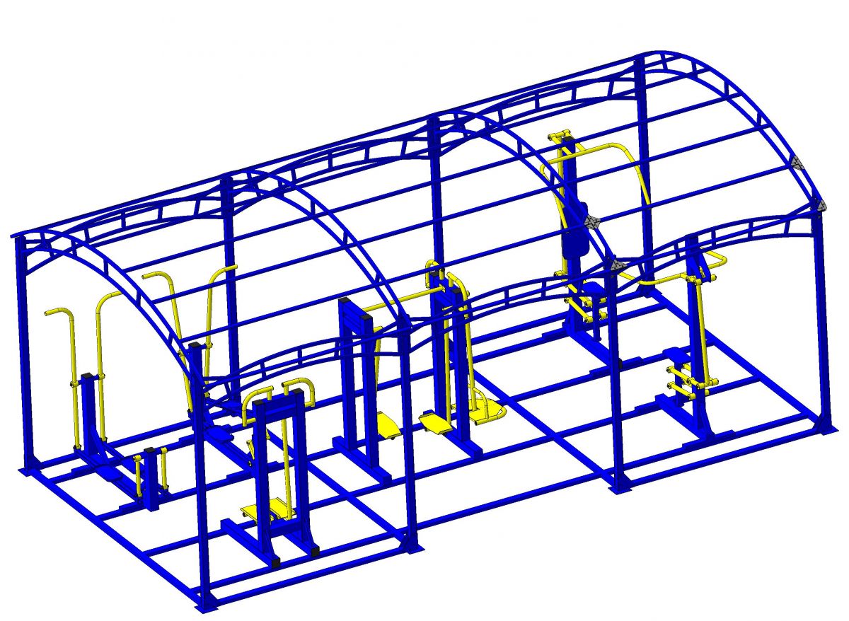 Возможно изготовление навеса как с бетонируемыми опорами и основаниями тренажеров, так и с креплением к металлической обрешетке.
